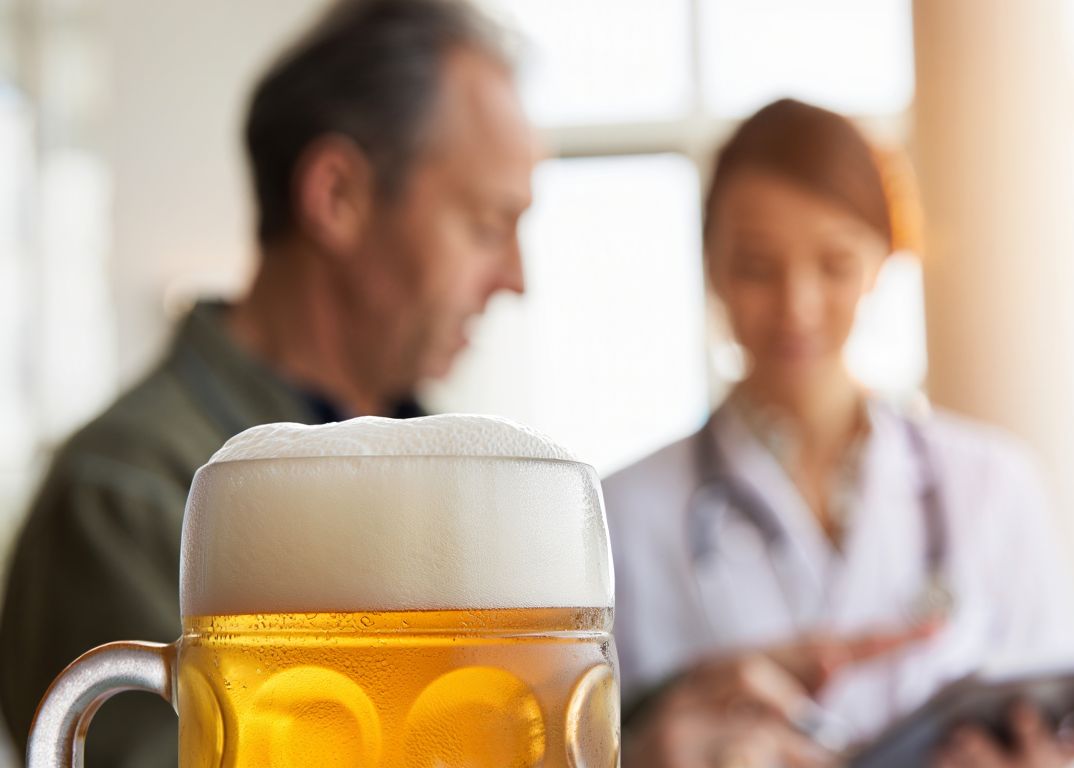 Мужчина беседует с врачом на фоне кружки пива